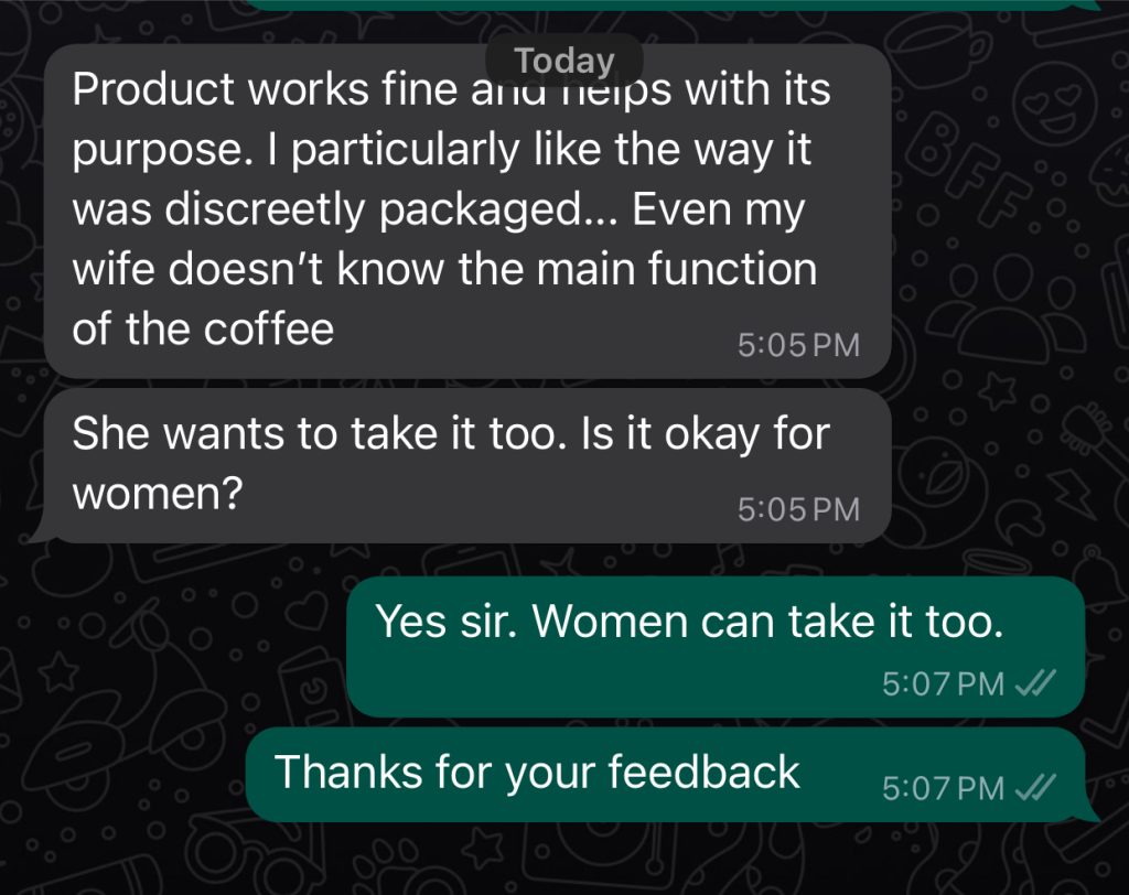 Ok, so here is where things got kinda interesting and weird. My "big guy" went into noodle mode within about 15 minutes after taking the coffee. I was in the restroom highly concerned that maybe my body was not accepting it. So I took my shower and left the restroom to lay down. At this point my wife was asking about us enjoying our hotel jacuzzi together and I had to tell her we should get sleep first as this was our first day at the hotel and usually we have to get sleep for a few hours anyway on our first day. As I slept, I noticed my “big guy” still was not available as usual and seemed to be in a state of shock. Almost as if my body was not responding. I continued to sleep for 3 hours. But when I woke, my big guy started to slowly awaken. It took about 10 minutes after I awoke but I was back to myself. Thinking the product was not good for me and had worn off, my wife and I had proceeded with what we came to do. And WOW! I was able to last as long as I wanted and we had the best night of our lives! Now, remember I’m still thinking the stuff had worn off so I’m thinking this is all me. We went at it again the next day and amazingly I had an even better performance because I had the experience with my new super power from the day before! I still was thinking this is all me. The reason I thought it was me is because I also take some sexual vitamins. It works on women too by the way. So I said wow these vitamins really increased my performance! It wasn’t until we got home and my wife and I “got together again” without the coffee a few days later did I realize it was indeed the coffee! I was still full of energy, but my super power was gone. To clarify, I used only one sachet and it lasted 3 days. It is clear, this stuff works differently for everyone. Lol, but, this stuff definitely works. But try it out at least a day before or at least early morning of the day of your event."