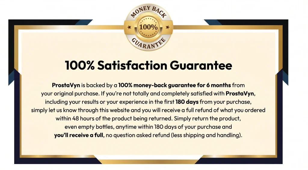 We are completely confident in ProstaVyn™. If you take it consistently for 30 days and see no meaningful improvement, contact us and we will refund your money in full — no long explanations required. Your investment is 100% protected.